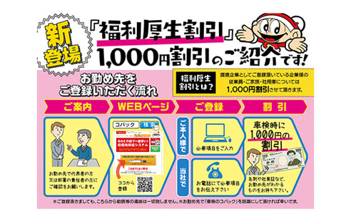 「車検のコバック」のオフィシャルHP内にある「福利厚生割引企業リスト」に登録頂く事により、企業の社員の方・ご家族の方・社用車において、車検基本料金を1000円割引させて頂くお得なシステムです。